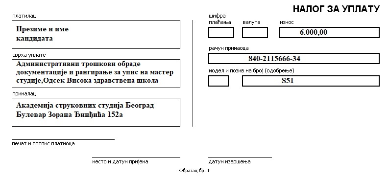 - Оригинал уплатнице за прву рату школарине у износу од 40.000,00 динара. Уплата се врши искључиво у пошти или банци на текући рачун Академије струковних студија Београд који ће бити видно истакнут на Сајту Академије.